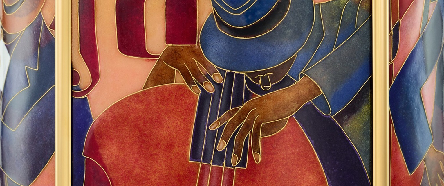 The rhythm, spontaneity and exuberance of jazz pulsates in the decor of this unique piece, showcasing the refined technique of grand feu cloisonné enamel. To create the stylized silhouettes of the musicians in full swing and the word “Jazz” used as a design element in the background, the artist patiently cut out, shaped by hand and fixed to the base plate about 18.3 m of flat 24K yellow-gold wire (20.3 g) with a cross section of 0.15 x 0.6 mm. Bringing his composition to life and conveying the heady sound of the music called for a palette of 48 solely transparent enamel colors, combined to produce superb gradients and layered effects. Each enamel element required 9 firings at a temperature of approximately 840°C. The hour circle is designed as a stylized keyboard, with black-lacquered hour markers and frames a dial center in cloisonné enamel. Caliber 17’’’ PEND, mechanical movement wound by an electric motor.