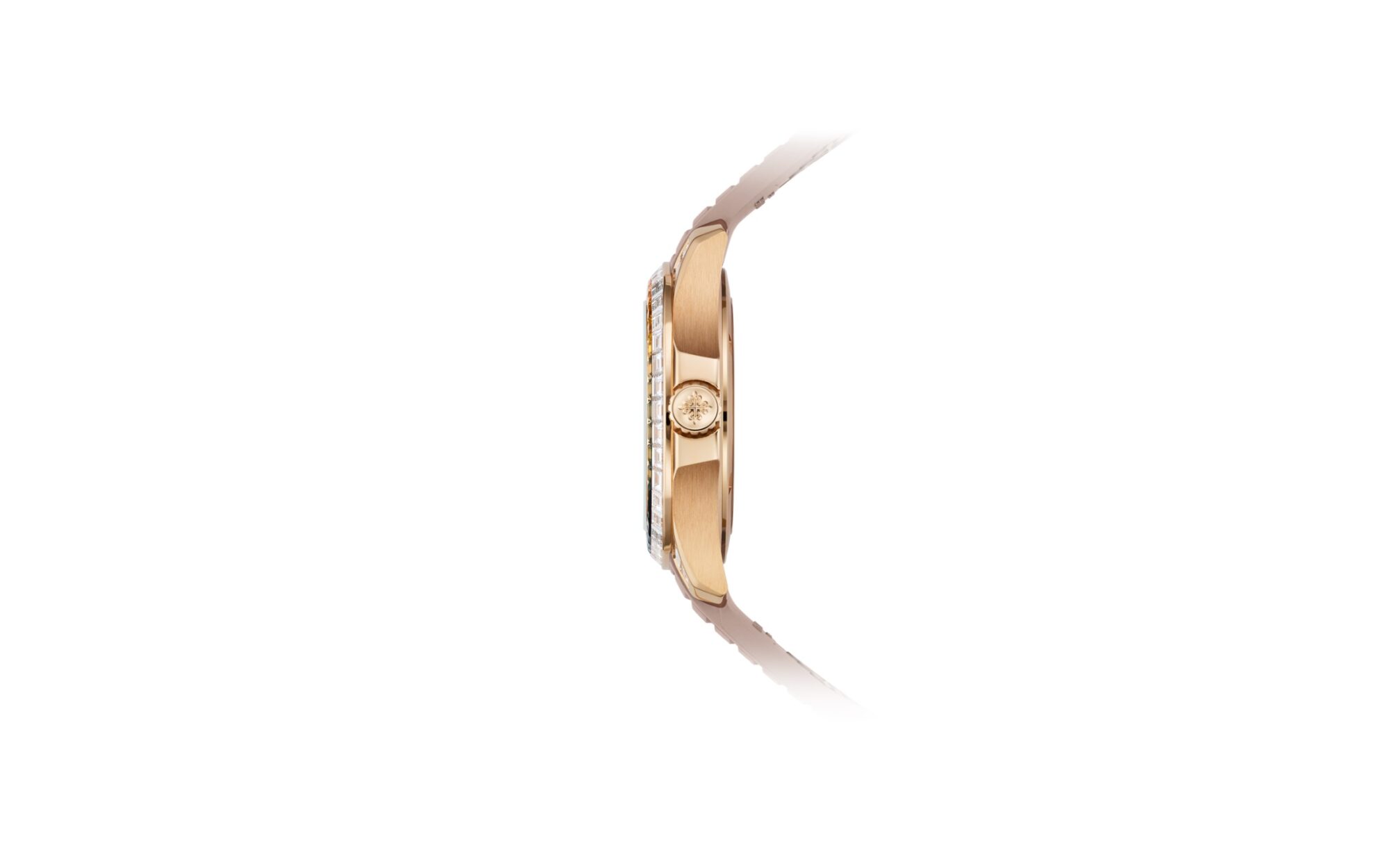 54 baguette-cut diamonds: 3.52 cts. (dial). 160 diamonds: 0.72 ct. (hour ring). 12 baguette multicolored sapphires: 0.59 ct. (hour markers). 40 baguette multicolored sapphires: 2.6 cts (bezel). 40 baguette diamonds: 2.85 cts. (bezel). 8 baguette diamonds: 0.58 cts (lugs). 10 baguette diamonds: 0.36 ct. (clasp). Total of 52 baguette multicolored sapphires (3.19 cts), 112 baguette diamonds (7.31 cts) and 160 diamonds (0.72 ct).