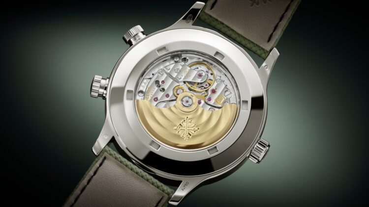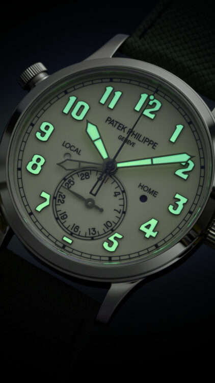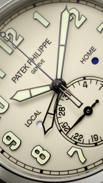 Two time zones: local and home time indication. Day/night indication for local time and home time in apertures. Date coupled with local time by hand. Sweep seconds.