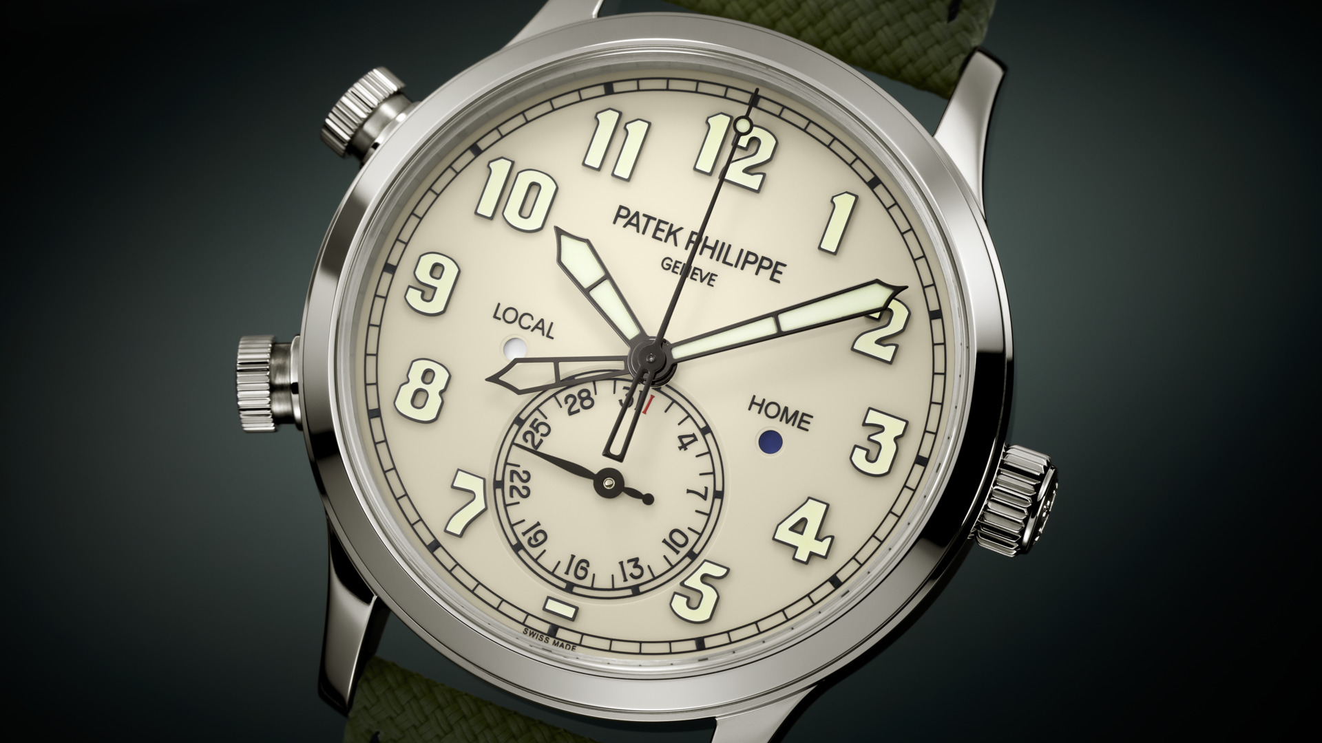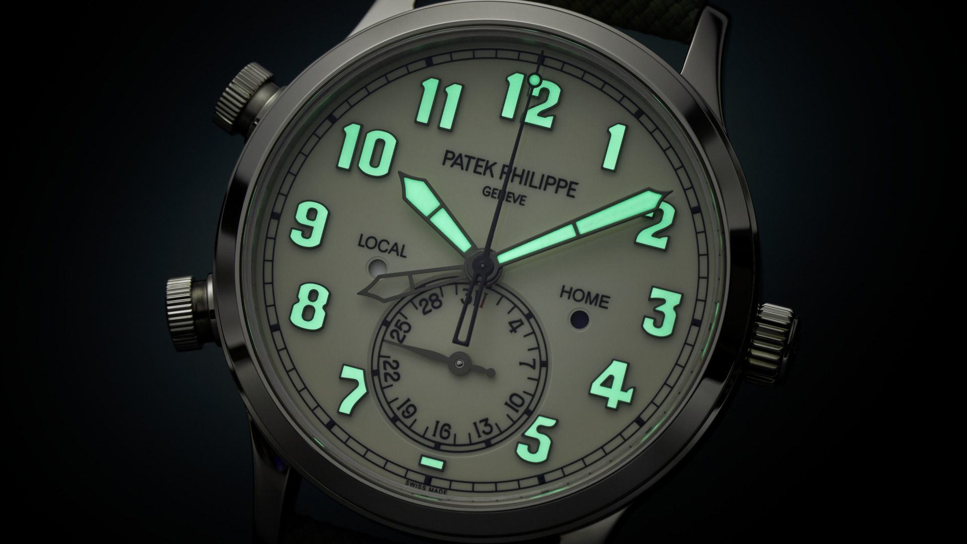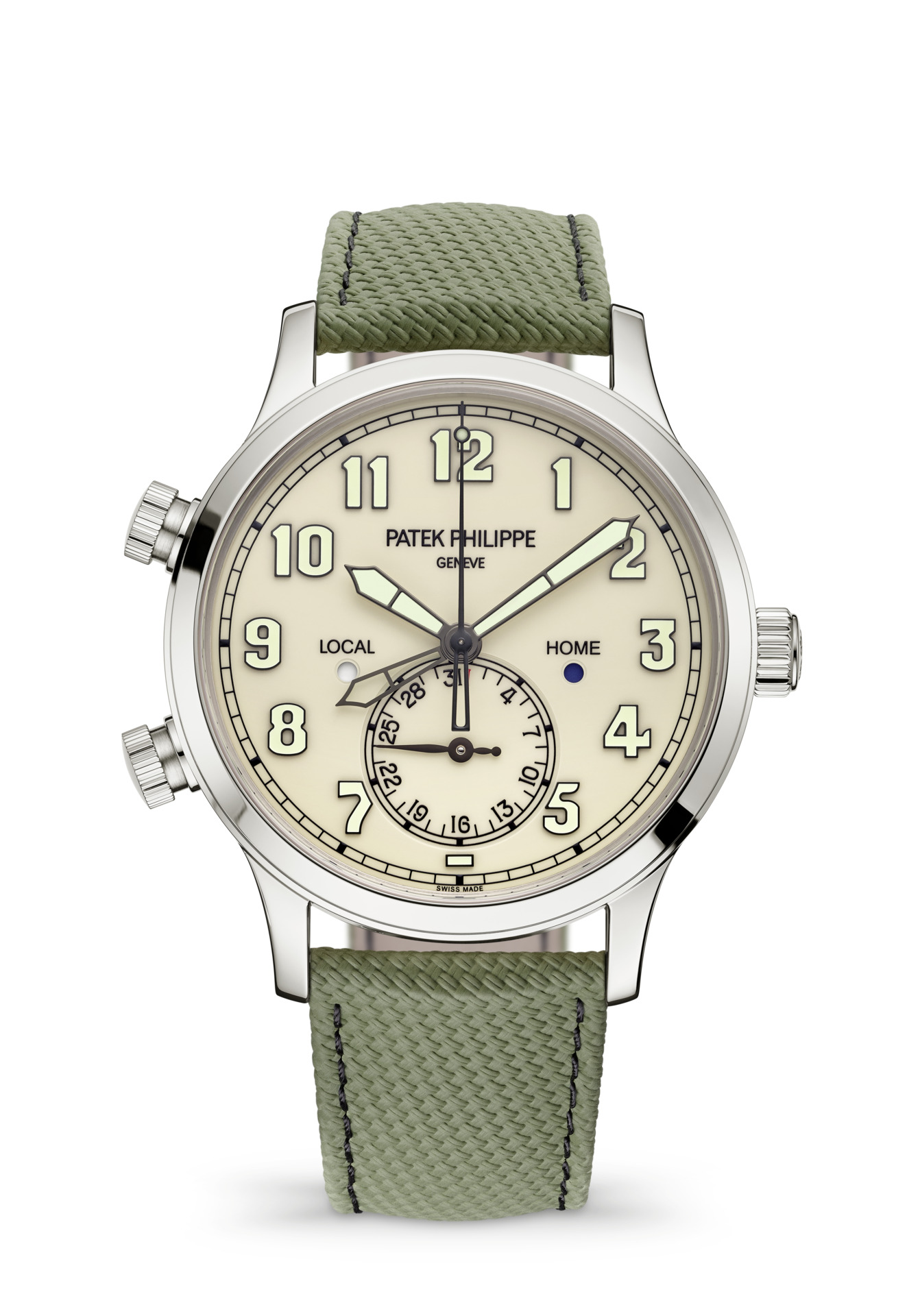 Two time zones: local and home time indication. Day/night indication for local time and home time in apertures. Date coupled with local time by hand. Sweep seconds.