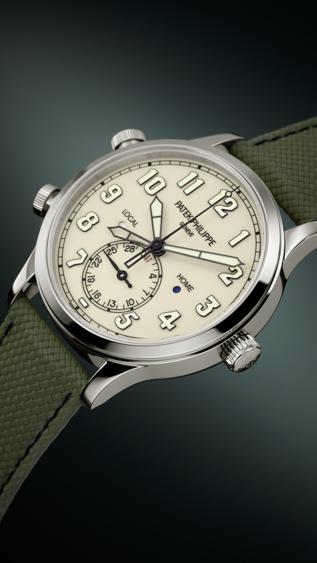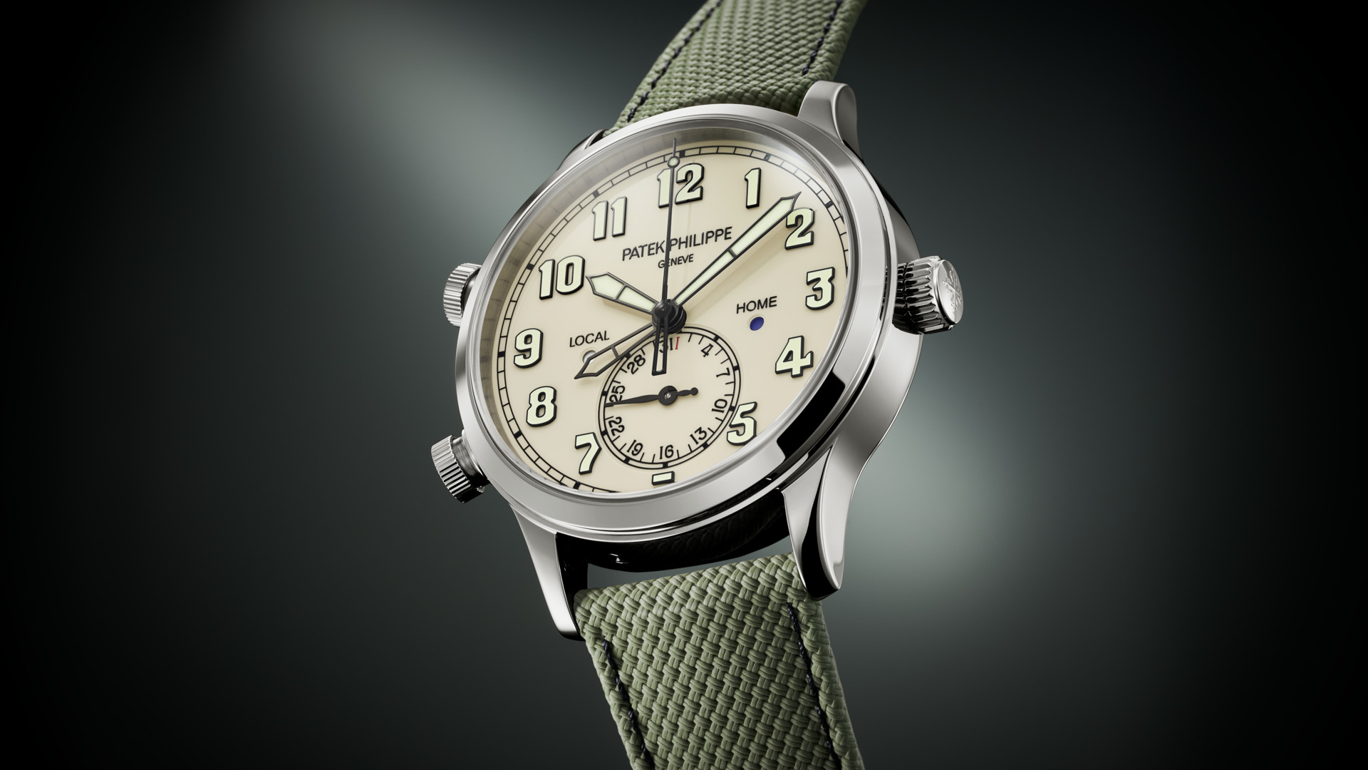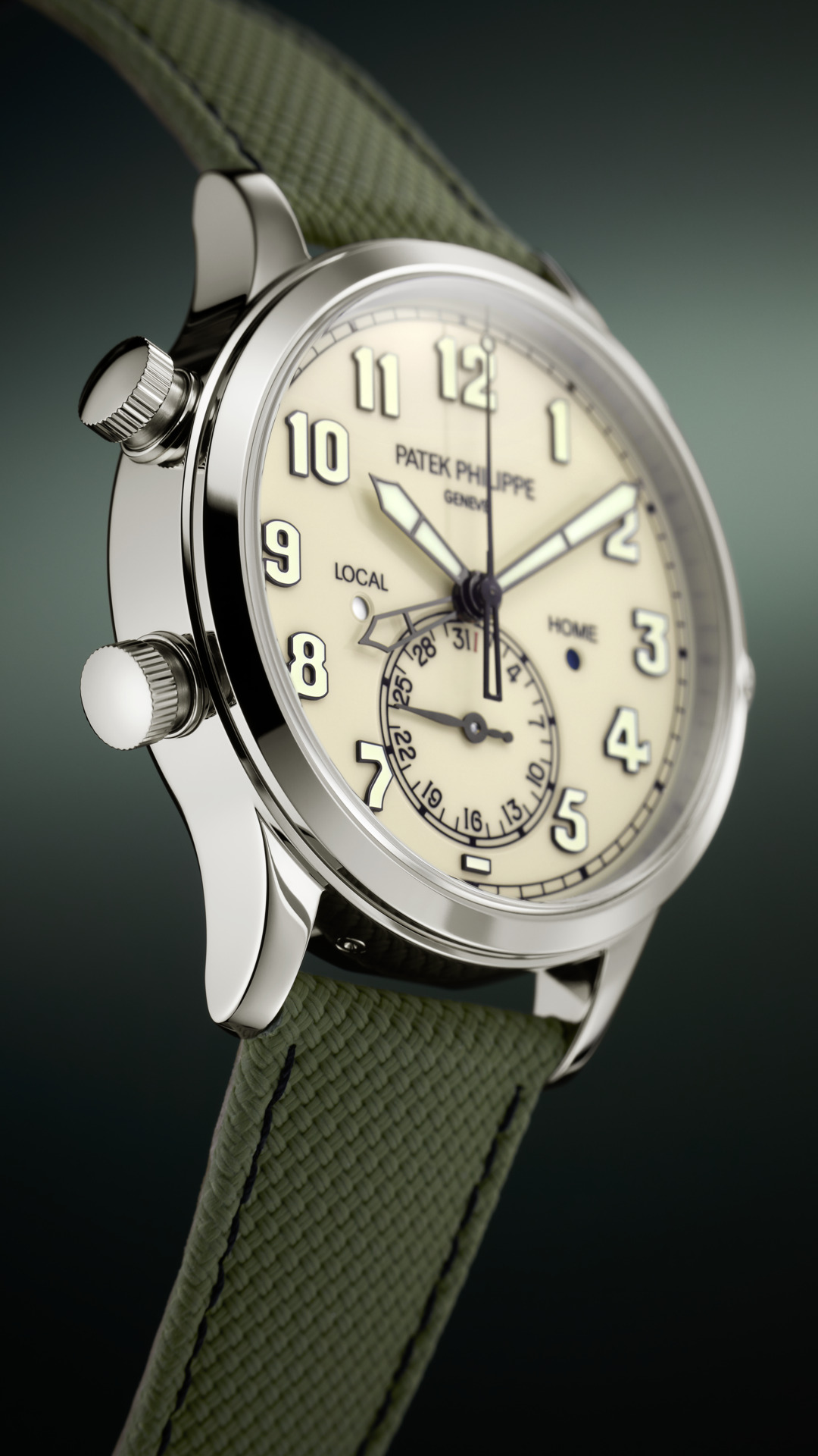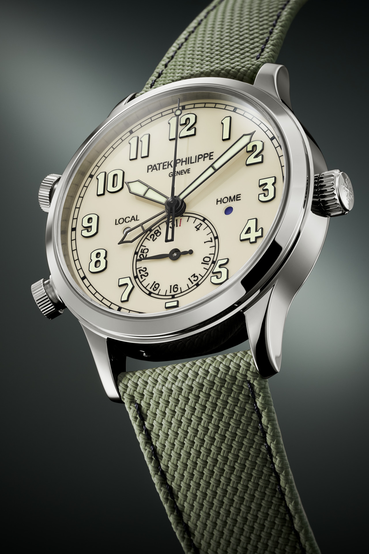 Two time zones: local and home time indication. Day/night indication for local time and home time in apertures. Date coupled with local time by hand. Sweep seconds.