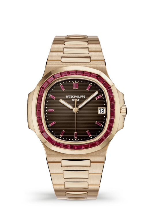Sunburst brown, horizontally embossed, rose gold applied hour markers set with baguette rubies (0.24 ct), Rose gold rounded baton-style hands with white luminescent coating.