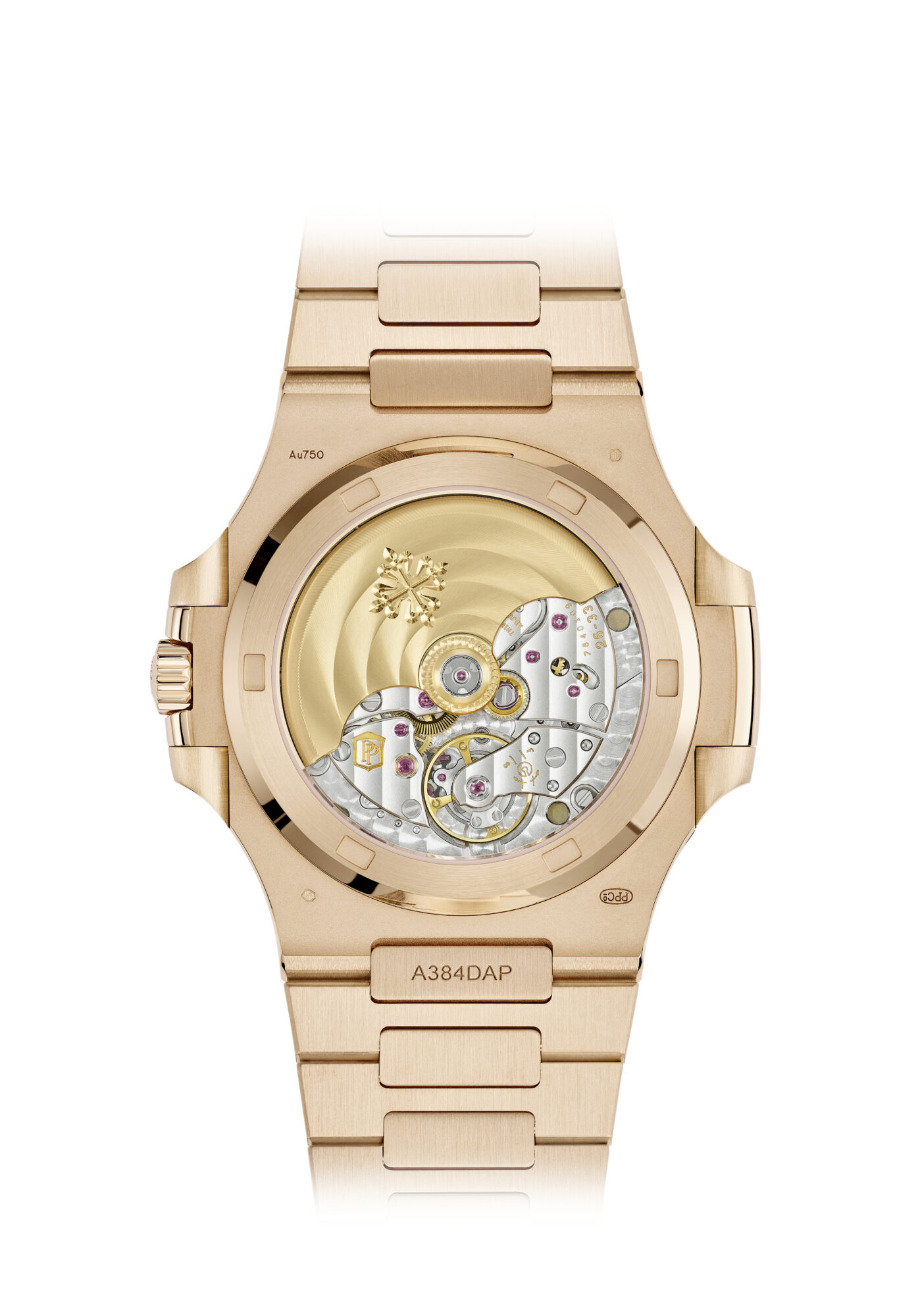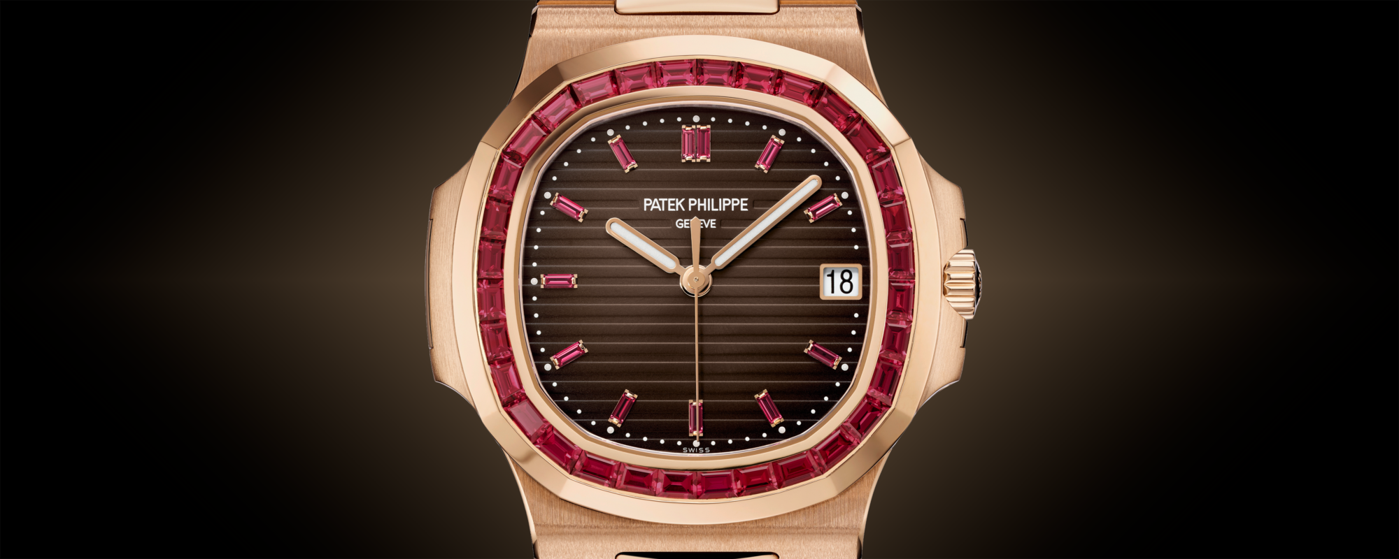 Sunburst brown, horizontally embossed, rose gold applied hour markers set with baguette rubies (0.24 ct), Rose gold rounded baton-style hands with white luminescent coating.