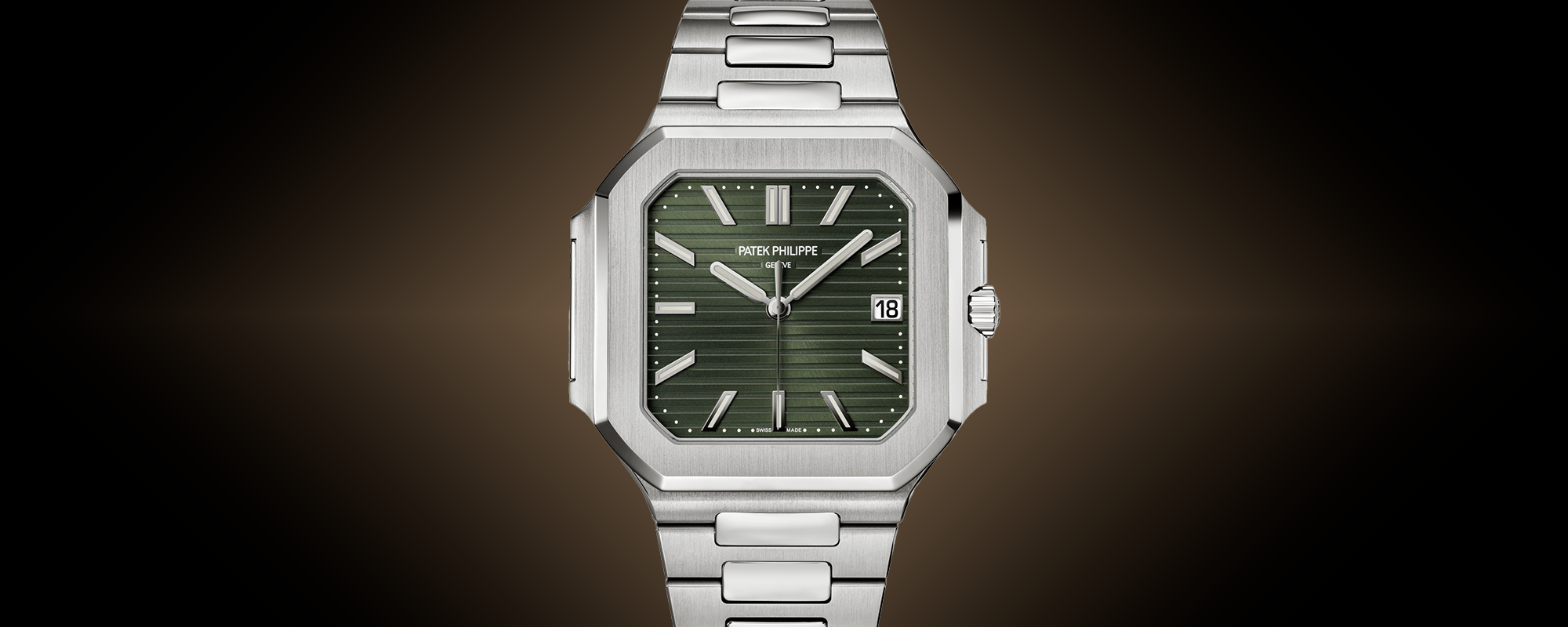 Sunburst olive green, horizontally embossed, white gold applied hour markers with white luminescent coating.