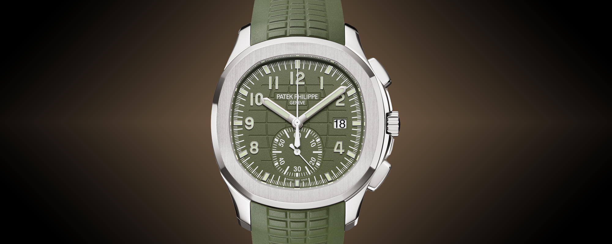 Khaki green, embossed with Aquanaut pattern, gold applied numerals with luminescent coating.