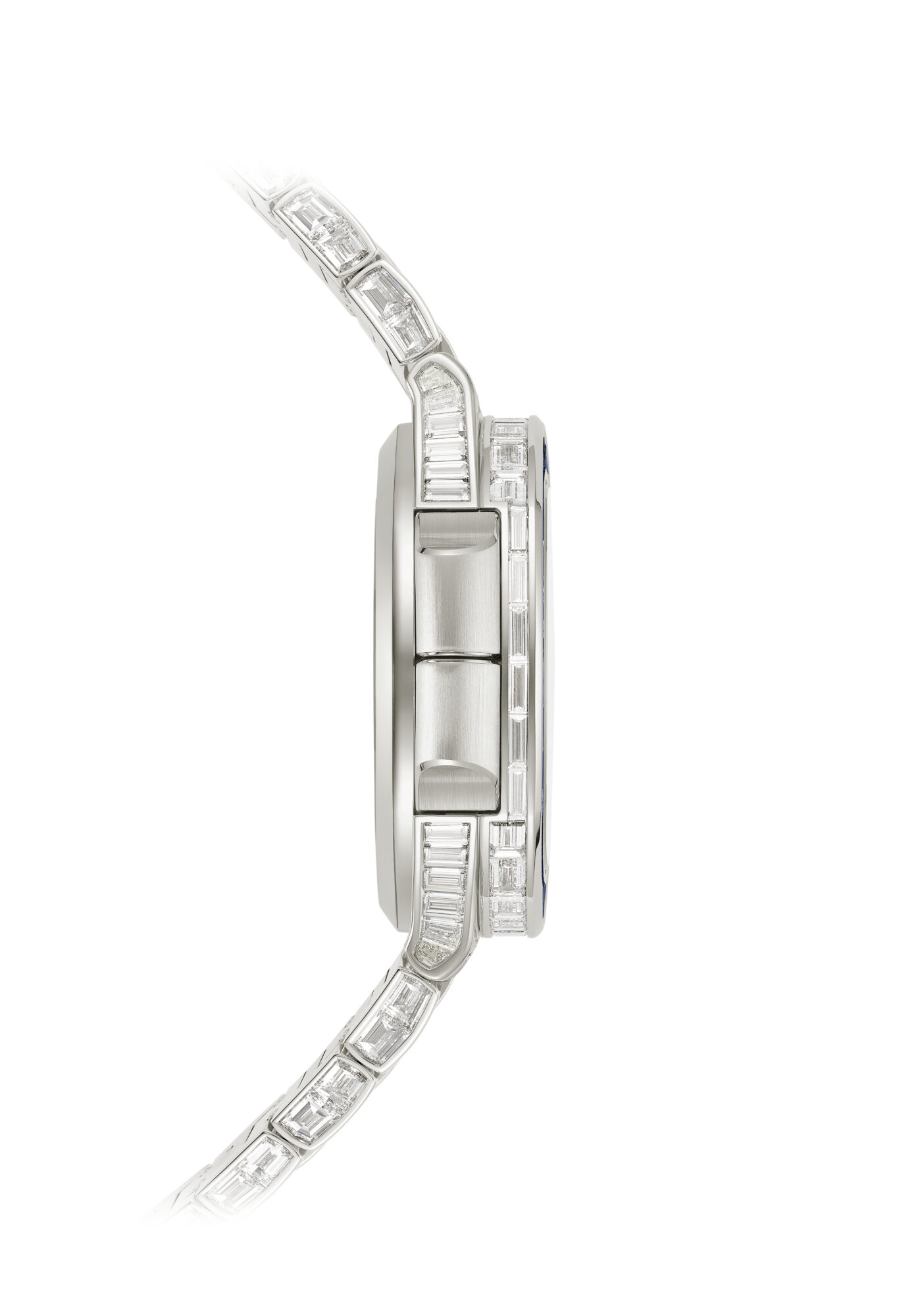 Case: 38 baguette diamonds (3.48 cts). Crown: 12 baguette diamonds (0.2 ct). Bezel: 32 baguette diamonds (4.47 cts) and 32 baguette sapphires (6.38 cts). Hour markers: 4 baguette sapphires (0,08 ct) and 6 princess sapphires (0.03 ct). Bracelet: 324 baguette diamonds (24.96 cts) and 150 baguette sapphires (10.98 cts). Total of 406 baguette-cut diamonds (33.11 cts) and 192 baguette-cut sapphires (17.47 cts)