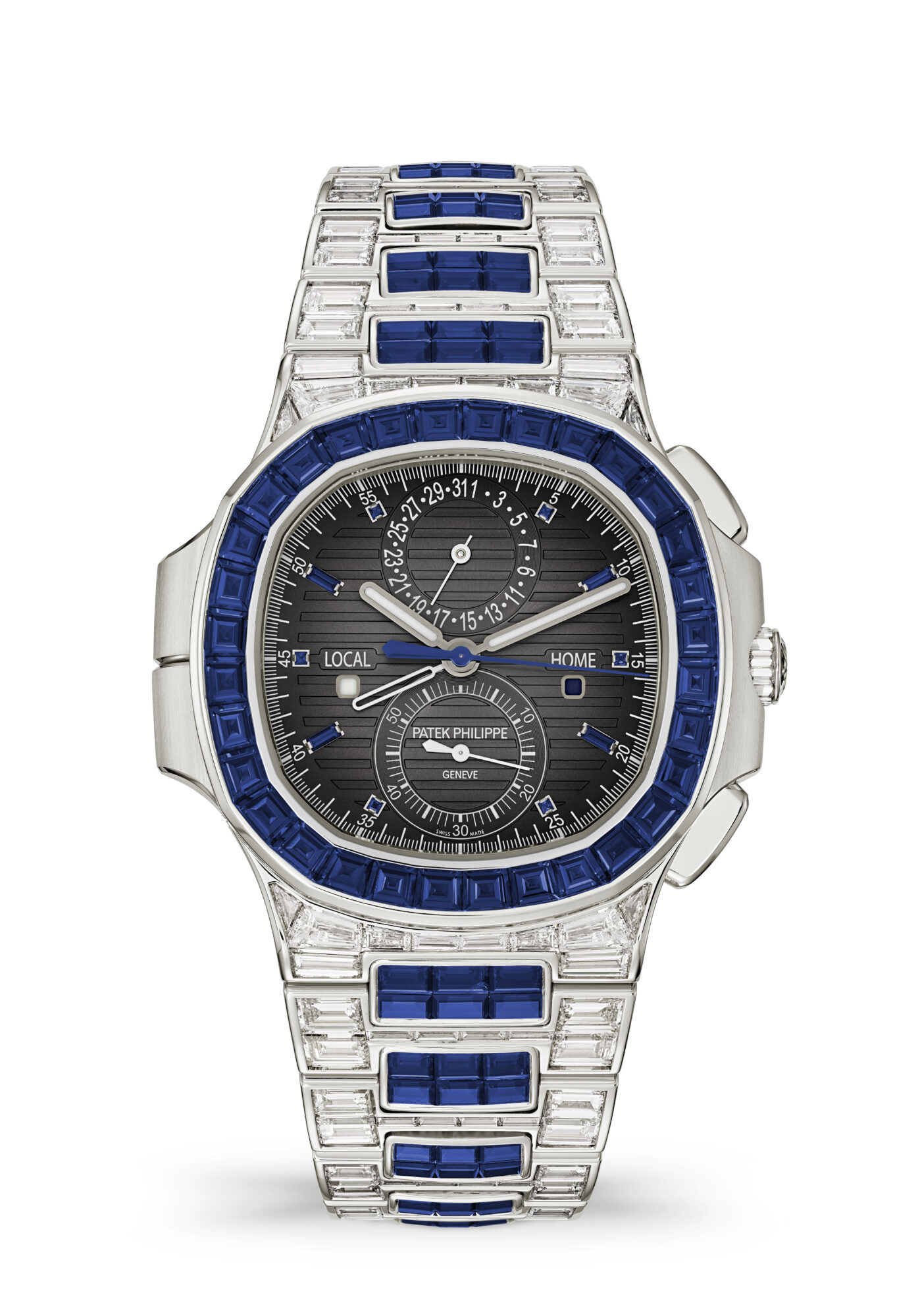Sunburst charcoal gray with black-gradient rim, horizontally embossed, white gold applied hour markers set with baguette sapphires (0.11 ct), Local time hand: white gold rounded baton-style with white luminescent coating, Home time hand: white gold skeletonized rounded baton-style, white varnished.