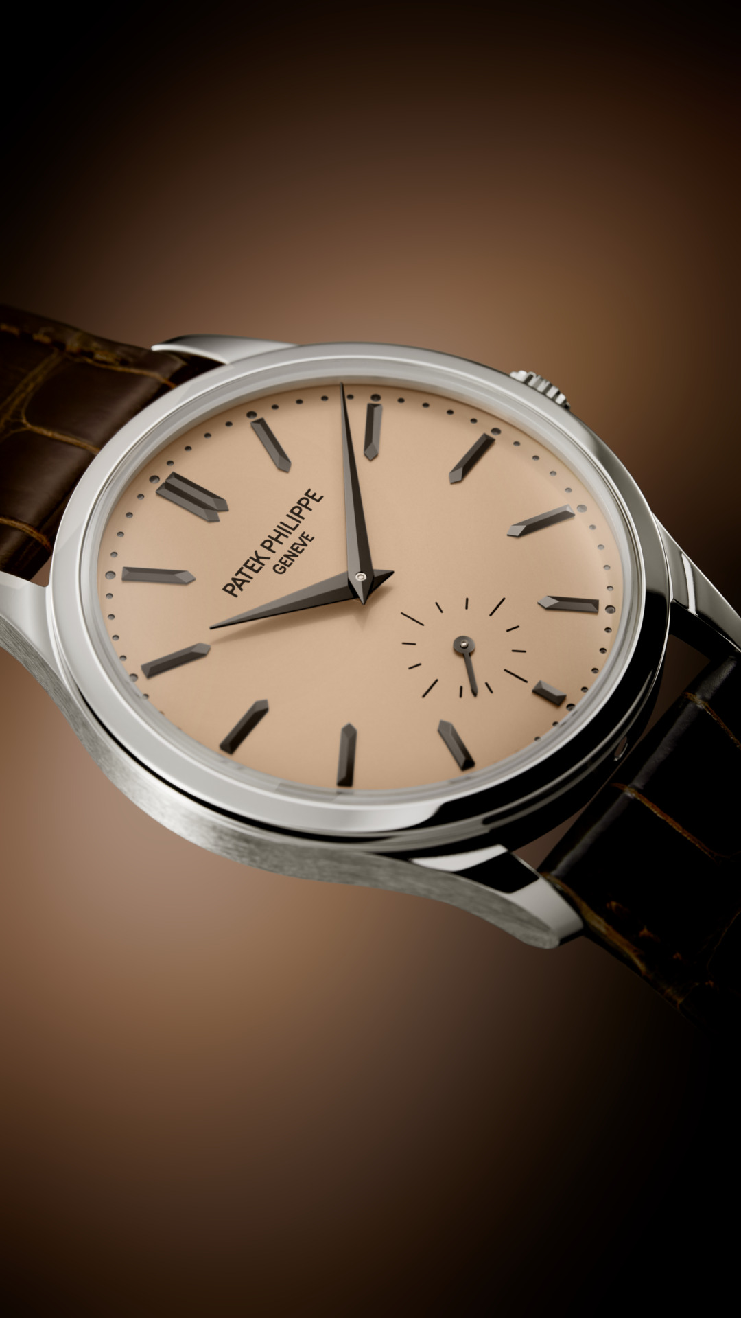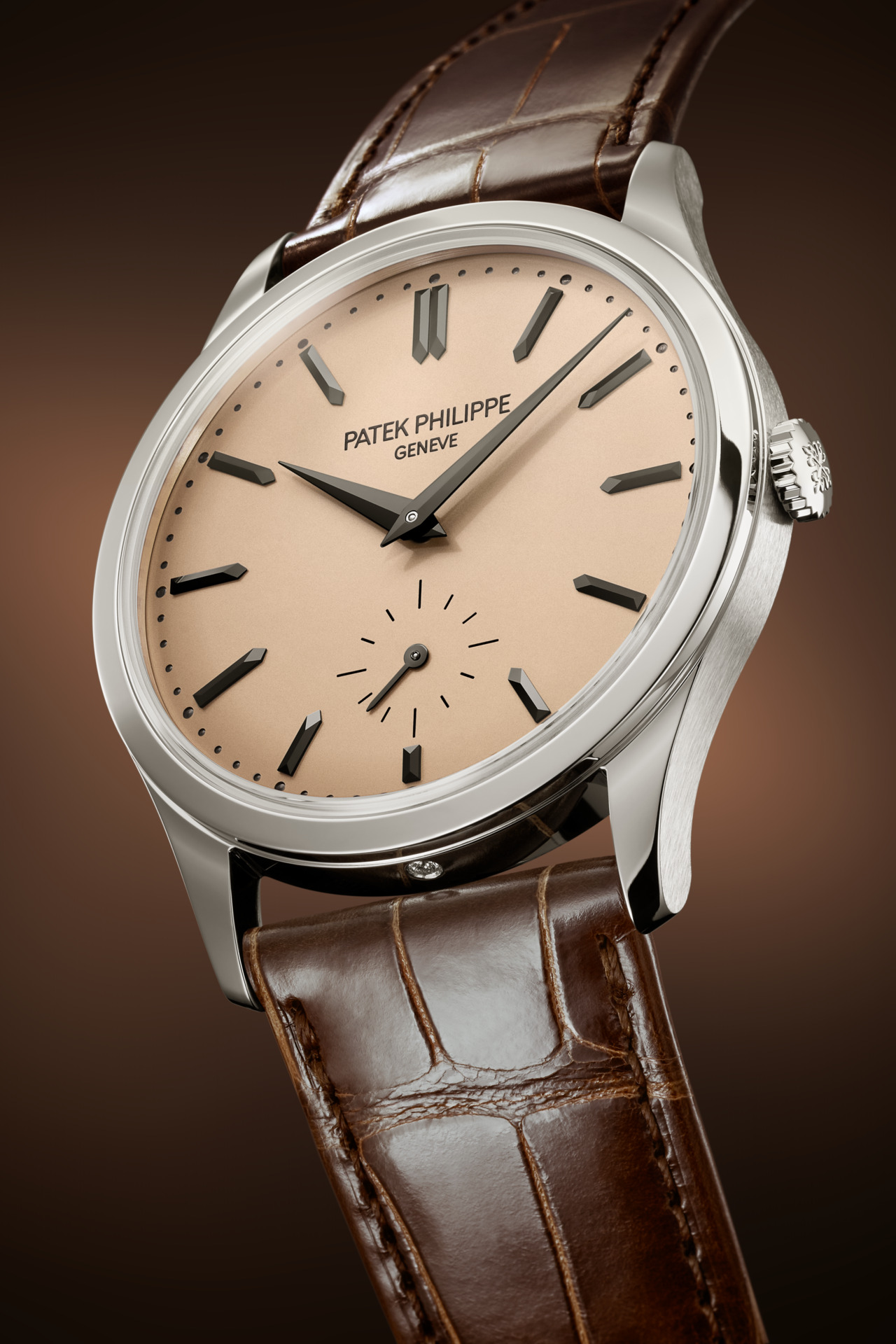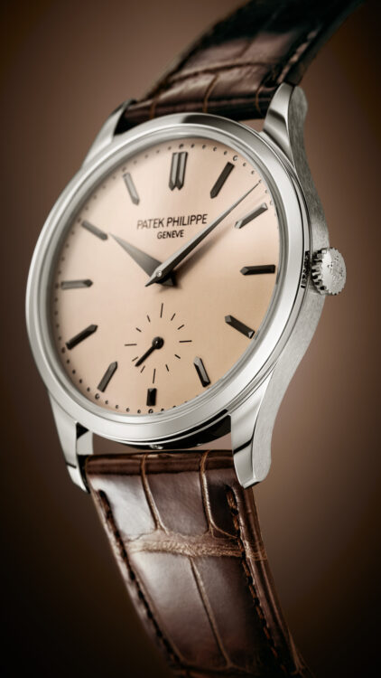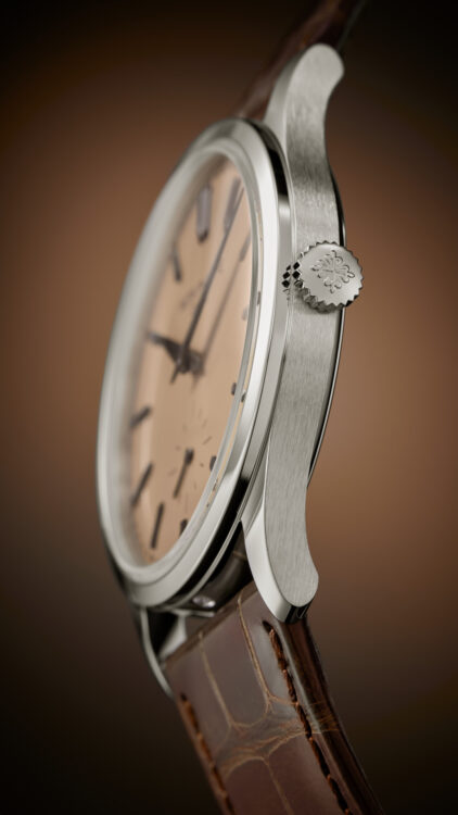 Rose-gilt opaline, anthracite white gold applied faceted "obus"-style hour markers.