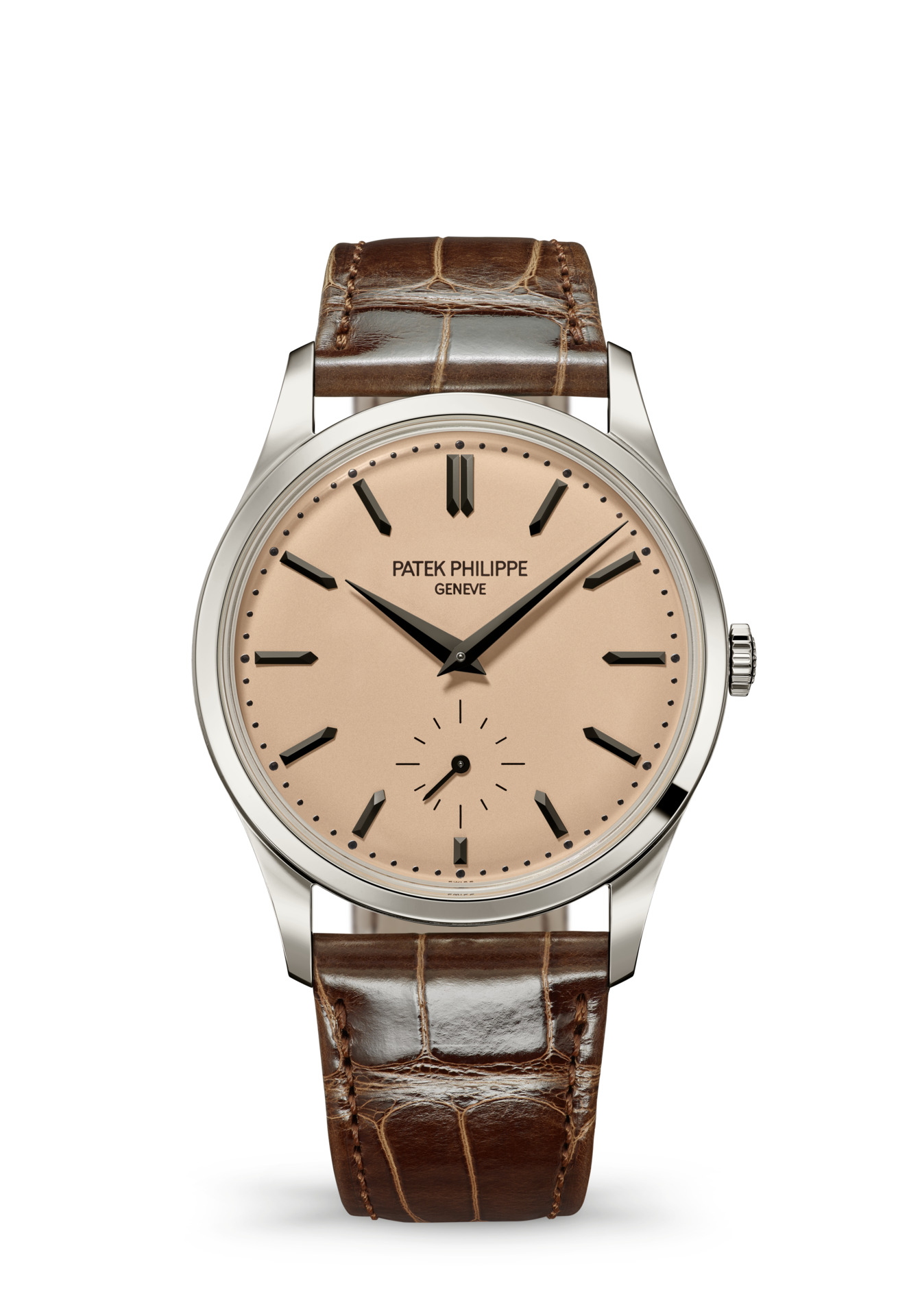 Alligator leather with square scales, shiny chocolate brown. Platinum prong buckle.