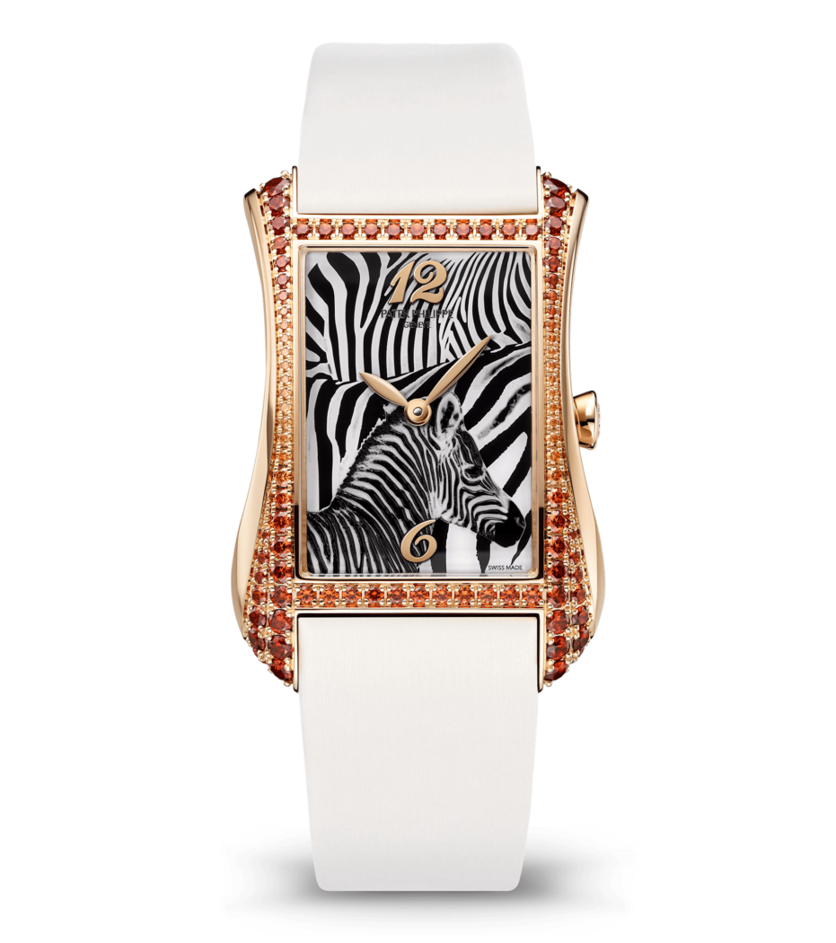 Paved with 251 diamonds (~0.73 ct) set in a circular pattern and 12 trapeze-cut diamond hour markers (~0.14 ct). 18K gold dial plate.