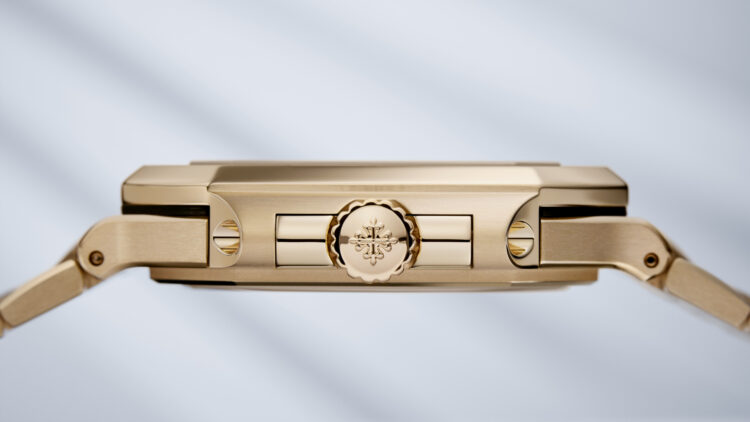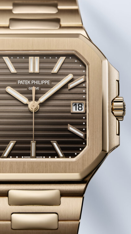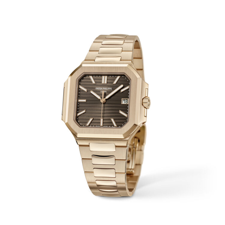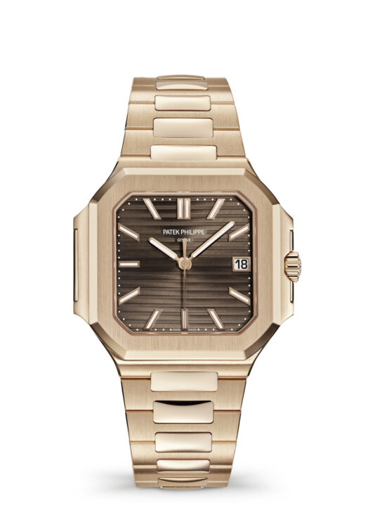 Sunburst brown, horizontally embossed, rose gold applied baton-style hour markers with white luminescent coating.