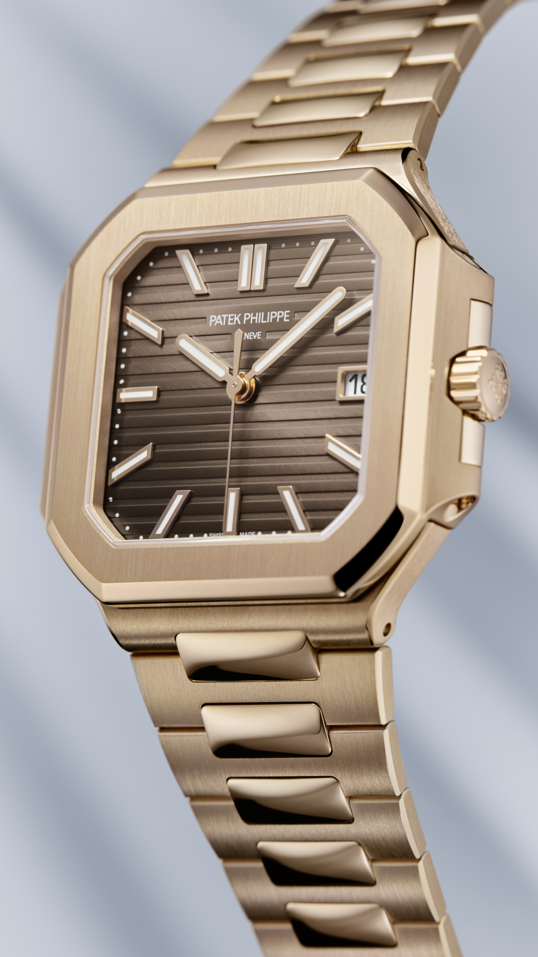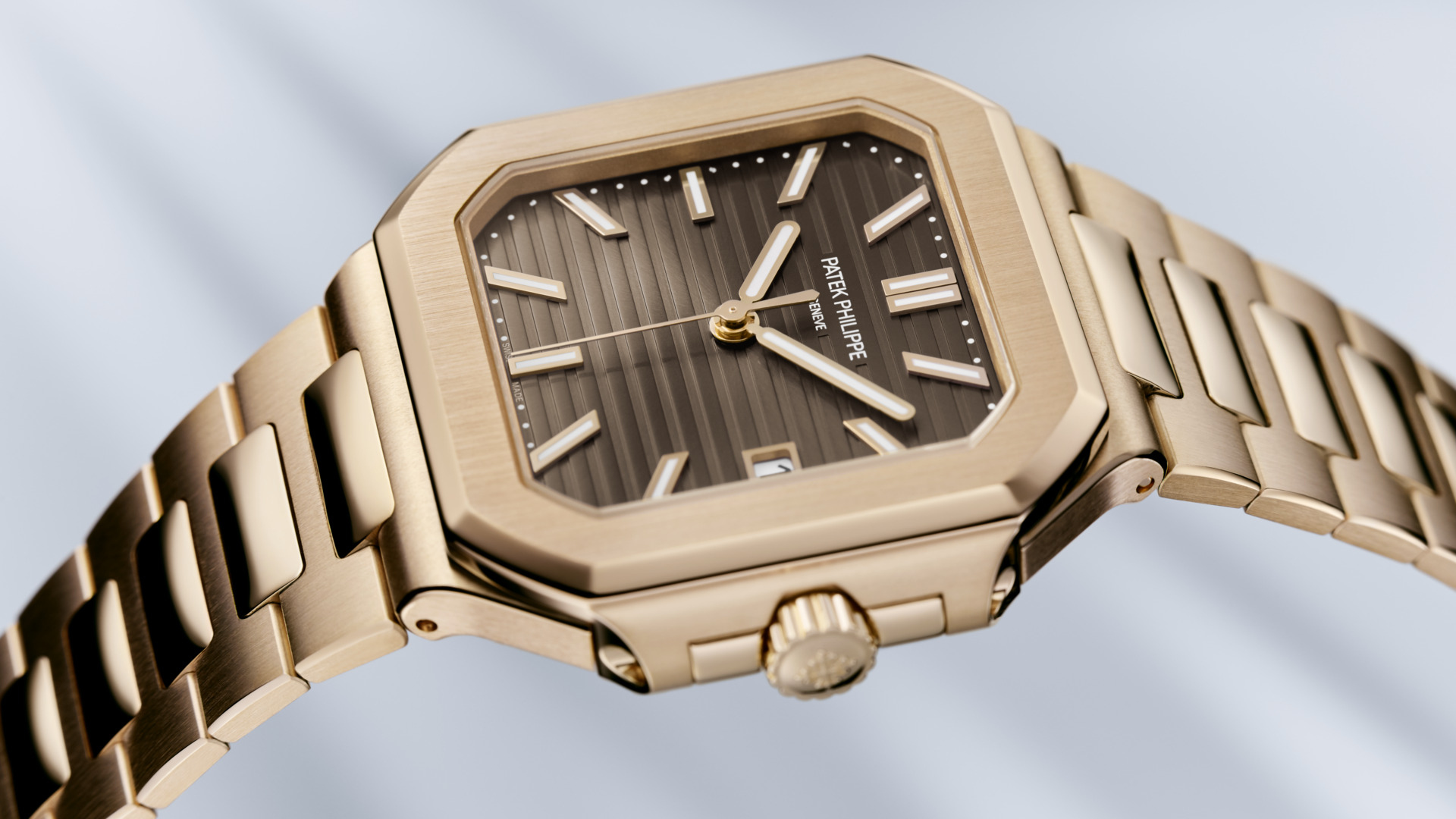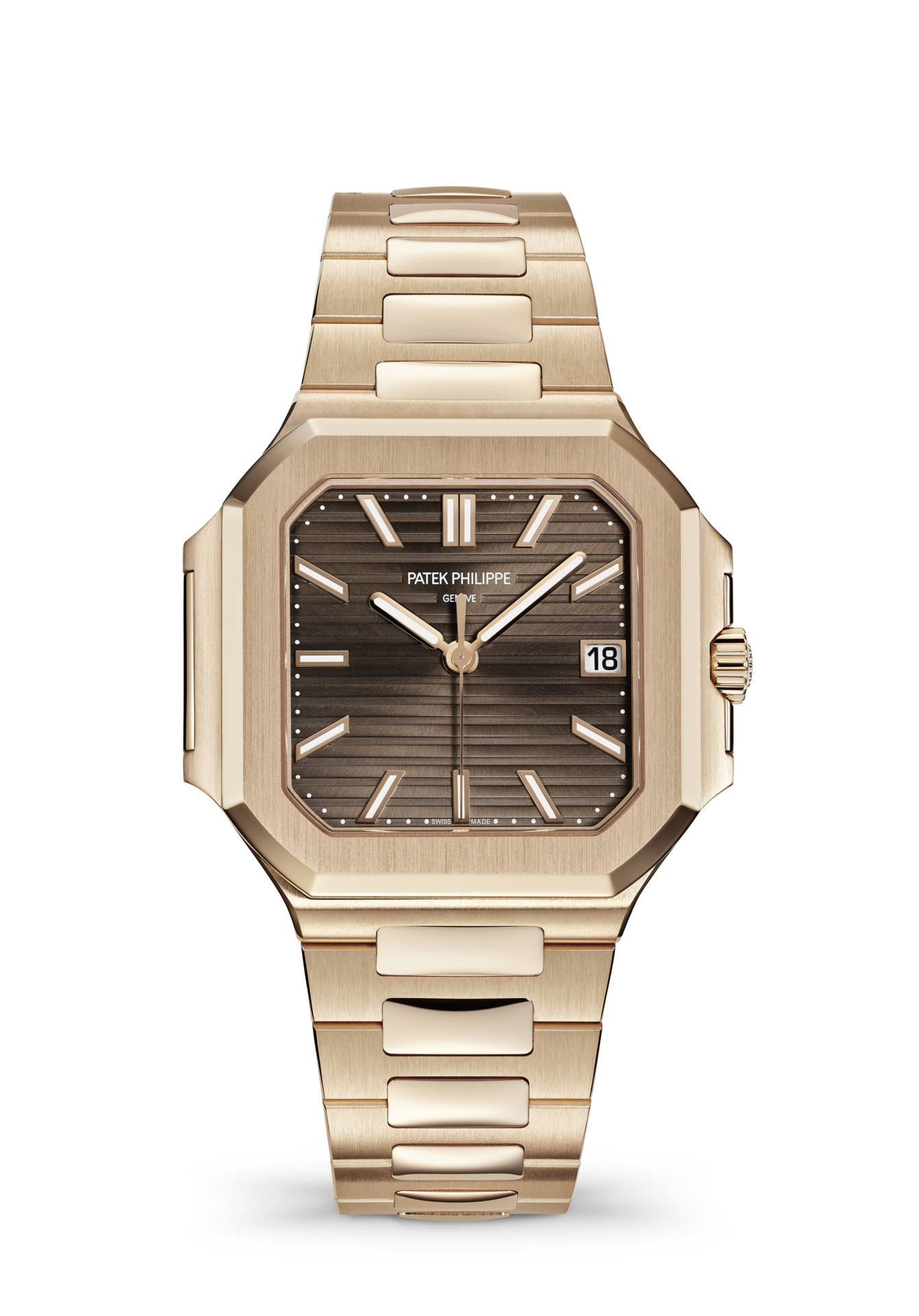 Sunburst brown, horizontally embossed, rose gold applied baton-style hour markers with white luminescent coating.